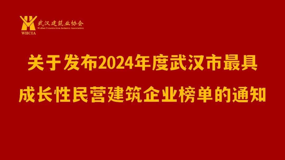 为深入贯彻党的二十大精神,促进民营经济发展壮大,提升民营经济整体实力、创新能力、市场竞争力,充分发挥优秀民营企业示范引领作用,协会于今年组织开展2024年度“武汉市最具成长性民营建筑企业榜单”发布工作。根据《关于开展2024年度武汉市最具成长性民营建筑企业榜单认定发布工作的通知》(武建协〔2025〕26号)文件要求,经过企业自愿申报、专家评委初审、网络信用查询、行业主管部门复核、网上公示及协会会长办公会审议通过等合规程序,2024年度武汉市最具成长性民营建筑企业榜单已经确定,现予以发布。